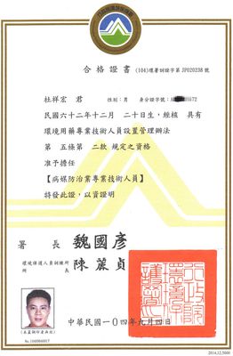 衛豐有限公司是環保署認證合格的除蟲公司,工作團隊擁有病媒防治專業技術人員合格證書,使用的藥劑及器材皆符合環保規定,專業的技術讓客戶能夠安心委託,服務過的客戶包括公司行號、工廠、社區大樓、機關團體、餐廳、學校、診所、飯店....等等,對於病媒防治相當在行,是有口皆碑的北投除蟲、淡水除蟲公司。提供責任施工、定期追蹤的服務,24小時有專員免費勘查諮詢,專業的服務品質讓顧客都相當滿意。衛豐有限公司的除蟲費用合理公道,讓您能夠擁有良好的生活品質,有相關需求的朋友們請多加利用。